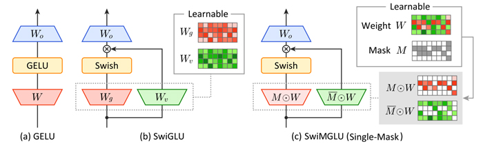 Gated Linear Units (GLUs) have become essential components in the feed-forward networks of state-of-the-art Large Language Models (LLMs). However, they require twice as many memory reads compared to feed-forward layers without gating, due to the use of separate weight matrices for the gate and value streams. To address this bottleneck, we introduce Masked Gated Linear Units (MGLUs), a novel family of GLUs with an efficient kernel implementation. The core contribution of MGLUs include: (1) the Mixture of Element-wise Gating (MoEG) architecture that learns multiple binary masks, each determining gate or value assignments at the element level on a single shared weight matrix resulting in reduced memory transfer, and (2) FlashMGLU, a hardware-friendly kernel that yields up to a 19.7 × inference-time speed-up over a naive PyTorch MGLU and is 47% more memory-efficient and 34% faster than standard GLUs despite added architectural complexity on an RTX5090 GPU. In LLM experiments, the Swish-activated variant SwiMGLU preserves its memory advantages while matching - or even surpassing - the downstream accuracy of the SwiGLU baseline.